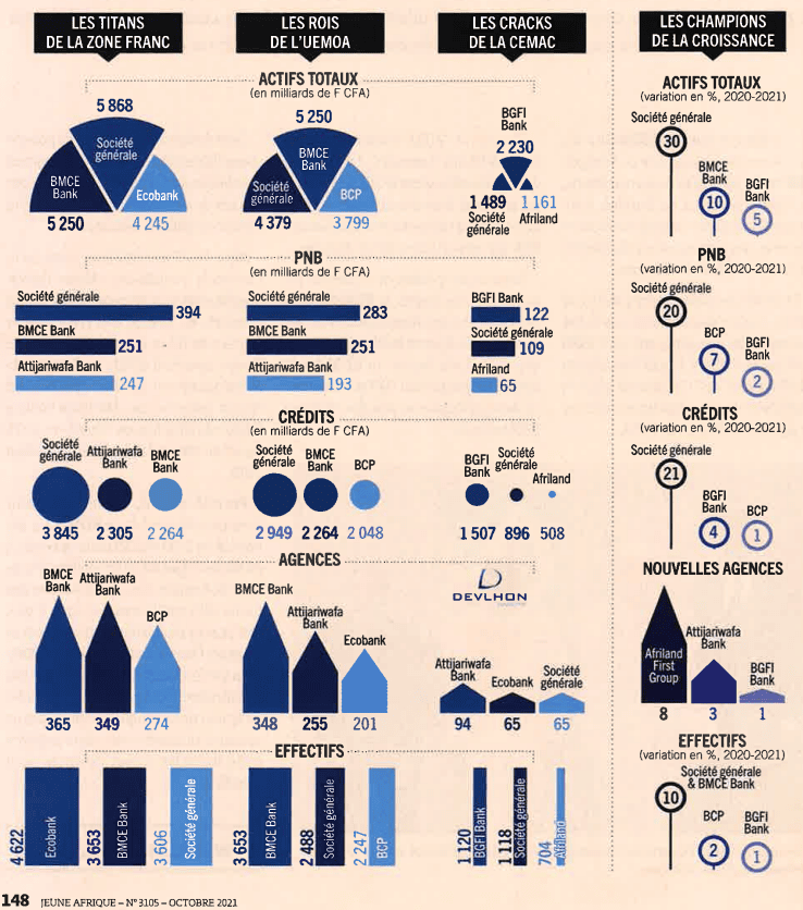 Jeune Afrique a compilé les bilans financiers des filiales des grands groupes bancaires de la zone franc pour l’année 2020. Les chiffres concernant les agences ont été compilés en exclusivité pour JA par le cabinet DEVLHON Consulting.