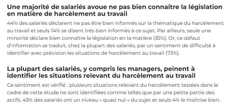 Ces chiffres sont alarmants mais, en fait, à quels comportements correspondent-ils ? L’article ne le dit pas et l’on n’en sait pas vraiment davantage en consultant Qualisocial. Sinon que l’article L. 1152-1 du Code du travail définit le harcèlement moral de manière particulièrement vague par « des agissements répétés ayant pour objet ou pour effet une dégradation des conditions de travail susceptible de porter atteinte à ses droits et à sa dignité, d’altérer sa santé physique ou mentale ou de compromettre son avenir professionnel. » Par ailleurs, pour que la situation relève du harcèlement moral, trois conditions doivent être réunies :