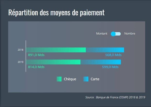 La carte bancaire (on en compte 72,7 millions en France) est le moyen le plus utilisé (60%) pour les dépenses courantes des ménages et il ne cesse de se développer. Pourtant, il semble se heurter à un plafond de verre, comme l’indique la survie des chèques, en nombres :